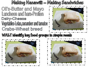 Hi today we learnt how to make a sandwich and how to sort out the things that we used to make them into the different food groups.The food group names are Carbs,Protein,Dairy,Vegetables,Fruits and Fats in our sandwiches we put things in the were in some of the groups not all of them but we put some of them in.